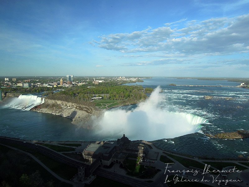 Les chutes du Niagara sont un ensemble de trois chutes d’eau situées sur la rivière Niagara qui relie le lac Érié au lac Ontario, dans l’est de l’Amérique du Nord, à la frontière entre le Canada et les États-Unis : 1/ Le "Fer à Cheval" ou chutes canadiennes 2/ Les "chutes américaines" 3/ Le "voile de la mariée", d’une taille moindre. Bien qu’elles ne soient pas particulièrement hautes, les chutes du Niagara sont très larges. Avec un débit de plus de 2 800 m3/s, elles sont les chutes les plus puissantes d’Amérique du Nord et certainement les plus connues à travers le monde. Renommées pour leur beauté, les chutes du Niagara sont aussi une source immense d’énergie hydroélectrique et leur préservation est un défi écologique. Cette merveille naturelle, haut-lieu du tourisme depuis plus d’un siècle, est partagée par les villes jumelles de Niagara Falls (New York) aux États-Unis et Niagara Falls (Ontario) au Canada.